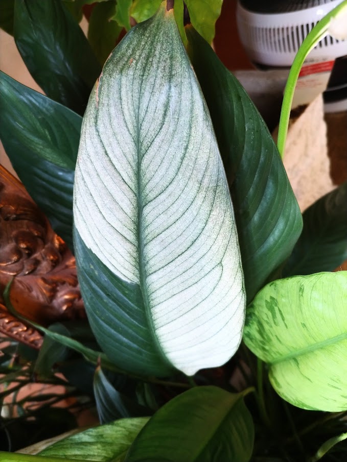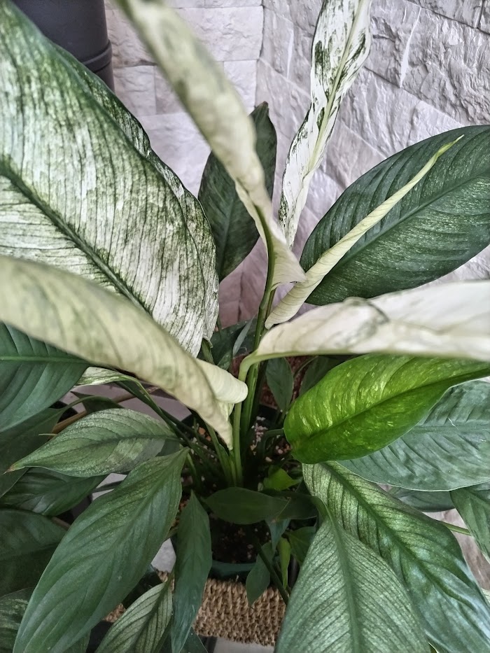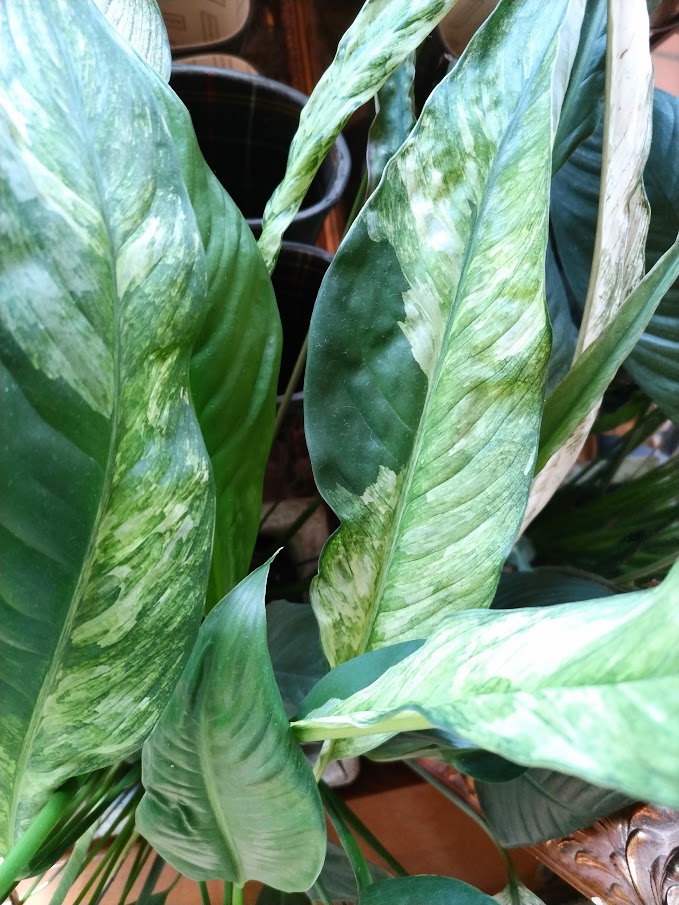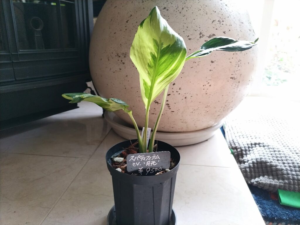 耐寒性が15℃というのは、普段目にするスパティフィラム(緑の葉に真っ白な仏炎苞と黄色の肉穂花序)の耐寒性は10℃といわれていますが、この1ヶ月の様子からして生育旺盛なタイプではないことと、斑入り(葉緑素エリアが少ない)であることを鑑みると15℃が無難化と感じました。